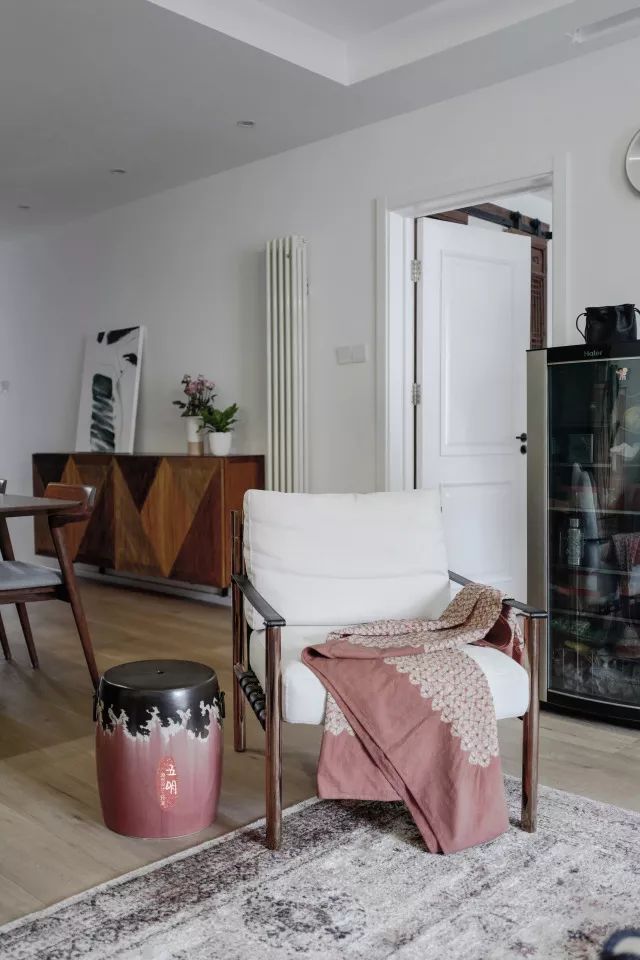 添一张木椅,放一个小鼓凳做边几,别致生动