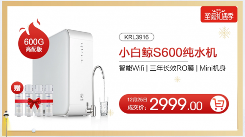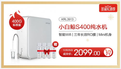 据悉,沁园本次携手京东为消费者带来的“圣诞嘉年华”活动还将以广受青睐的明星爆款小白鲸纯水机系列为主,在12月25当天购买产品不仅可享优惠价格,其中购买小白鲸S400系列、S500系列和S600系列纯水机都将获得由沁园附送的4根滤芯。