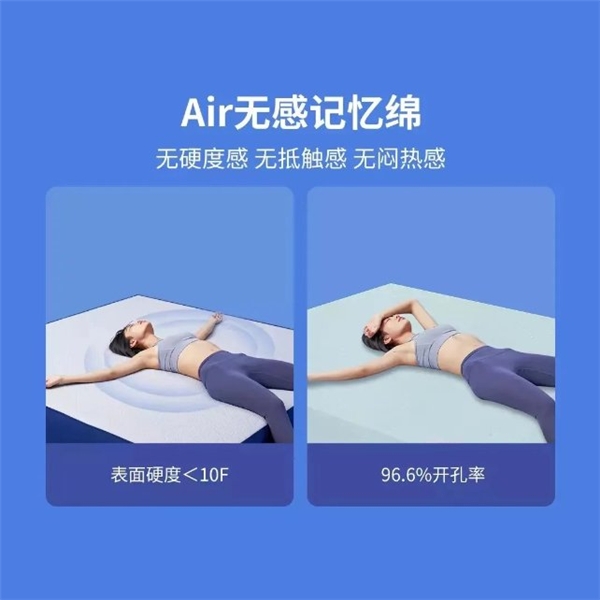 三线径九分区独立支撑模块,1.9mm、1.7mm、2.1mm线径弹簧给予肩颈、脊柱、腰臀不同的支撑。Air无感记忆绵表面硬度小于10F,更少抵触感,温柔化解疲惫。