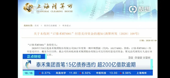 据央视财经报道,泰禾集团首笔15亿债券违约,超200亿借款逾期。泰禾发公告承认短期流动性出现困难。