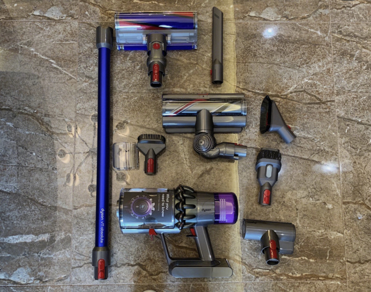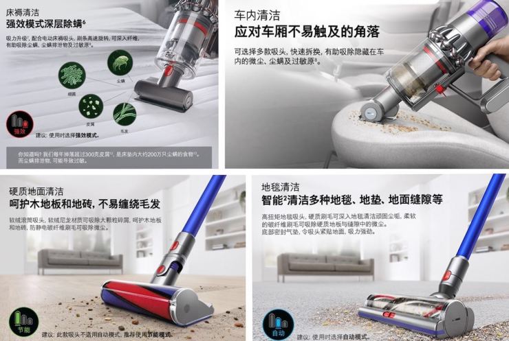dyson戴森V11 Absolute一共配备2个地板吸头及5个配件吸头,算是目前戴森所有在售手持吸尘器系列的“顶配装”。除了高扭矩地毯吸头外,还配备清洁硬质地面的软绒滚筒吸头,能轻松吸出大颗粒碎屑,吸除新装修房子地上残留的大颗粒尘土,完全不在话下;以及清洁床褥螨虫的电动床褥吸头,刷条高速旋转,深入纤维吸除螨虫、尘螨排泄物及过敏原。吸头很多,能应付各种清洁场景,新装修后的房子,尤其适用,因为各方面都要打扫,这一款吸尘器就能满足所有清洁需求,一机多用,非常方便。