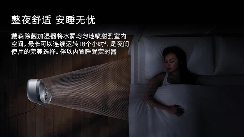 夜间睡觉较讨厌的就是有杂音,戴森AM10除菌加湿器电动机的外壳经过精确调校,通过减少震动的方式降低噪音。3L的大水箱可连续保持18个小时不需要换水,一夜安眠。