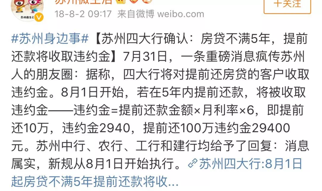 有关此类消息,早在去年就刷爆了行业全网,苏州四大行早已确认收取违约金的规定。