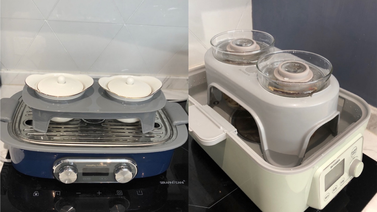 再来看看炖盅,两款都是两个炖盅带着一个支架。但炖的方式却不一样,摩飞的炖盅要直接放在蒸盘上,利用蒸汽来炖汤,能更好地锁住营养,保留食材原滋味;北鼎的需要摘掉聚能环,把炖盅放进水箱里,属于隔水炖汤,受热不是很均匀,容易破坏掉食材原有的营养和鲜美。