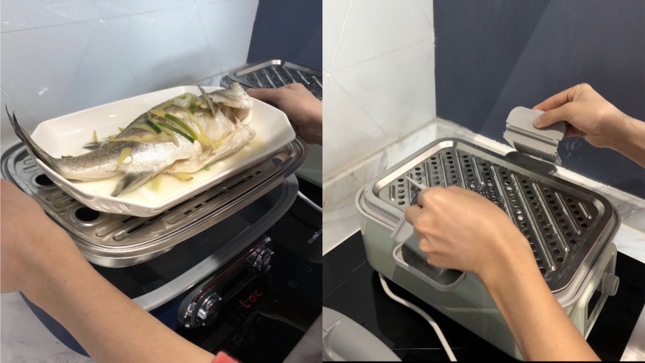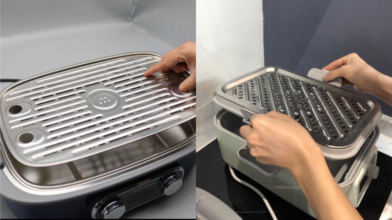两款锅都有独立积汁盘设计,都能做到脏水净水分离,食材一直蒸也会一直鲜。