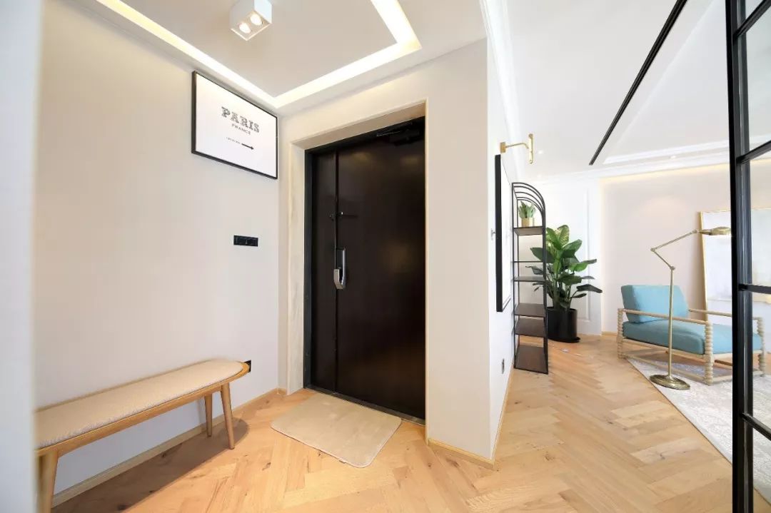 整个空间运用大量的建筑细节,例如老钢玻璃门照壁、带有复古花纹的冷轧钢通风口、内嵌的古铜装饰壁炉以及白色文化墙、卧室模仿自然光照明的廊架造型灯带等等,这些细部给空间带来丰富性和独特个性。