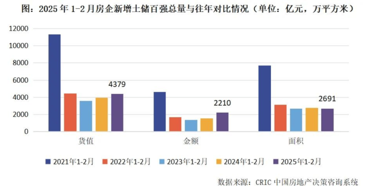 克而瑞监测数据显示,今年前两月,百强房企的新增货值、新增土地价值和新增土地建筑面积总计分别为4379亿元,2210亿元和2691万平方米,分别同比增加11.3%、43.5%和-2.2%。