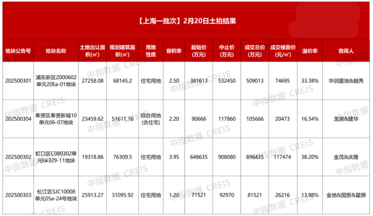 具体来看,在2月20日上海2025年第一批次土拍中,4宗涉宅地块全部溢价成交。其中,虹口区地块经过184轮竞价,最终由“中国金茂+庆隆”联合体以总价89.64亿元、溢价率38.2%竞得,成为上海去年8月实行“双高双竞”政策以来的总价“新地王”。