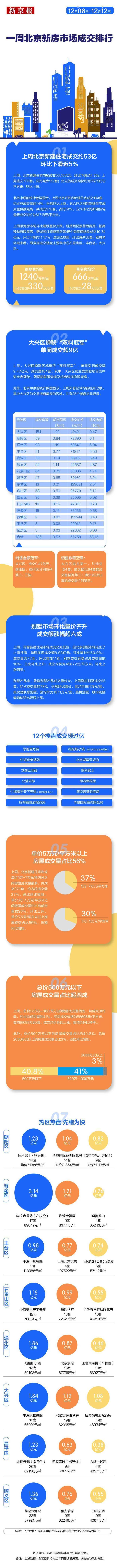 根据北京中原的统计数据,上周(12月6日-12月12日),北京新建住宅市场(不包括回迁房,剔除共有产权房,含普通住宅+高端住宅+别墅)共成交53.15亿元,环比继续下滑约4.7%;上周成交736套,环比减少112套;对应的成交均价约为55758元/平方米,环比回升。