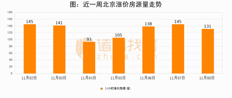 根据诸葛找房数据显示,北京24小时涨价房源量为131套,较11月07日减少14套,环比下降9.7%。与此同时,涨价房源占比小幅回落,对于购房者来说是一个入市窗口期,购房者可抓住时机入市。