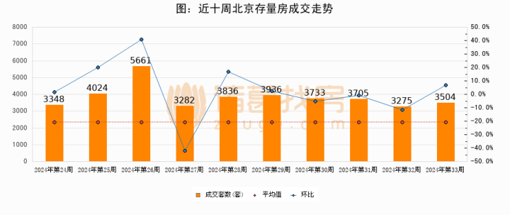 存量房方面,第33周北京存量房成交3504套,较上周增加229套,环比上涨7%。从近十周成交走势来看,周均成交套数为3830套,本周低于平均水平8.5%。