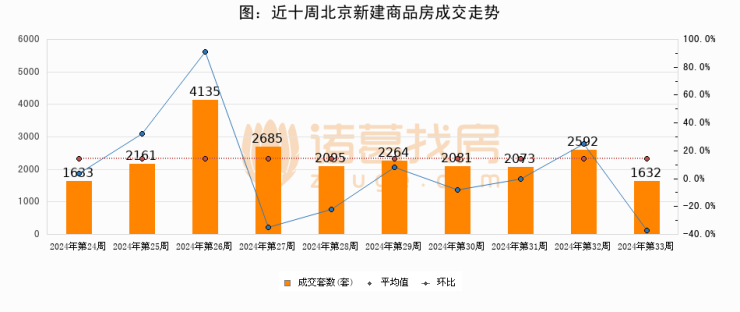 进入2024年第33周(08月12日-08月18日),北京新建商品房成交1632套,较上周减少960套,环比下降37%。从近十周成交来看,周均成交套数为2335套,本周成交1632套,低于近十周平均成交量30.1%。