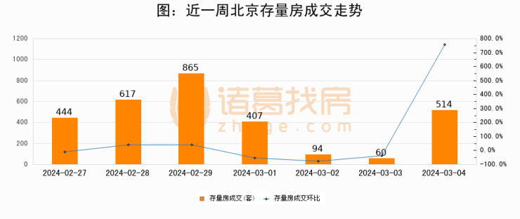 从存量房来看,2024年03月04日北京存量房单日成交514套,比昨日增加454套,环比上涨756.7%。从近一周存量房成交来看,北京存量房日均成交套数为428套,03月04日单日成交514套,高于近一周平均水平20.1%。