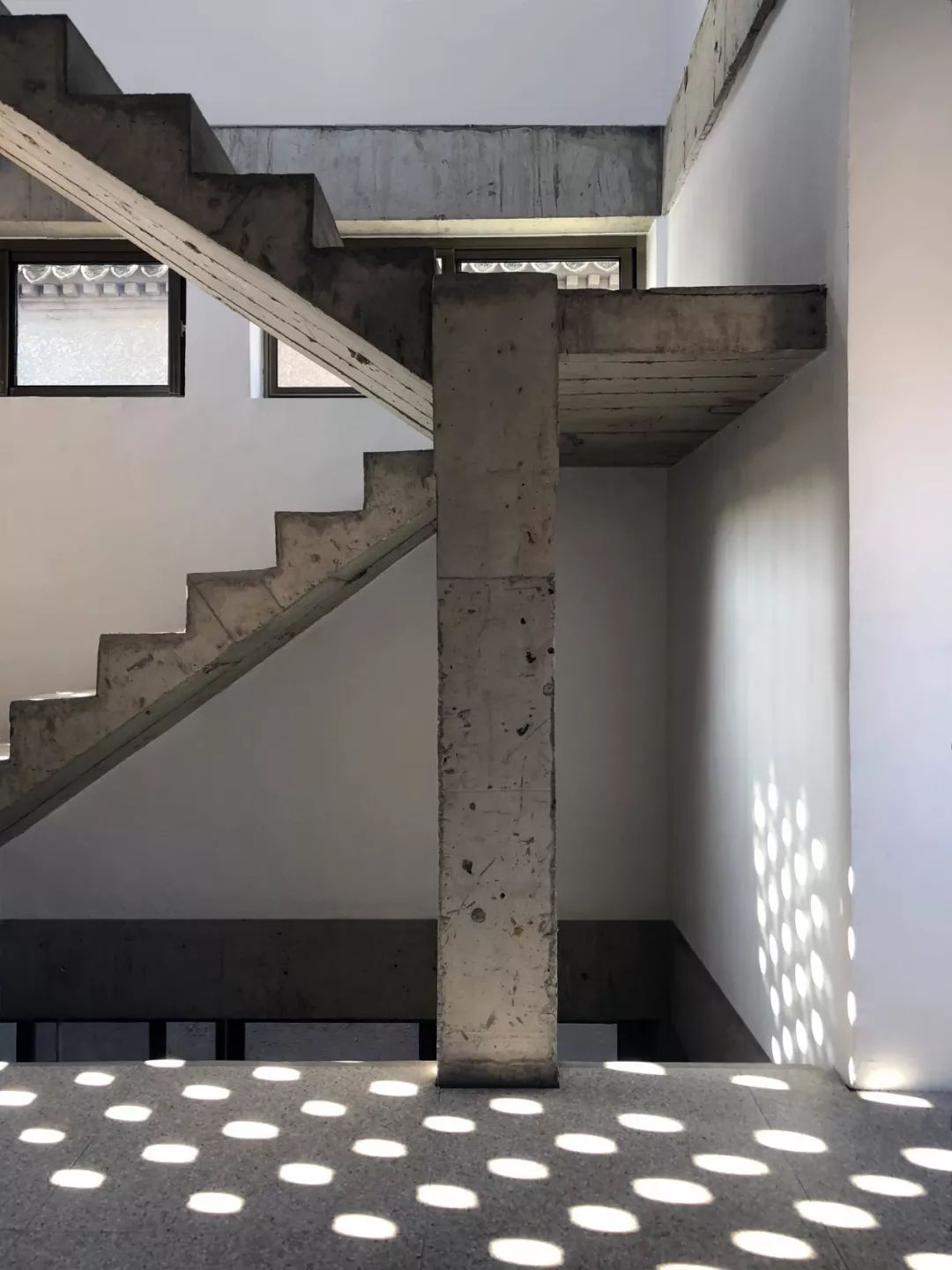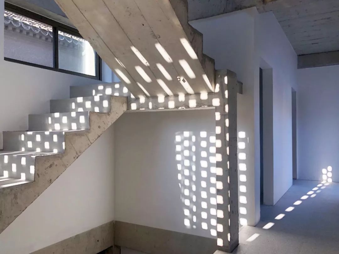 蓝色或灰色砖在北京和中国东北地区历史上盛行,但由于种种原因越来越少使用了。今天,廉价红砖主要用于房屋。两种不同砖色的立面设计消除了对比并创造了平衡。此外,红砖上可见的焦痕会合并两种色调。