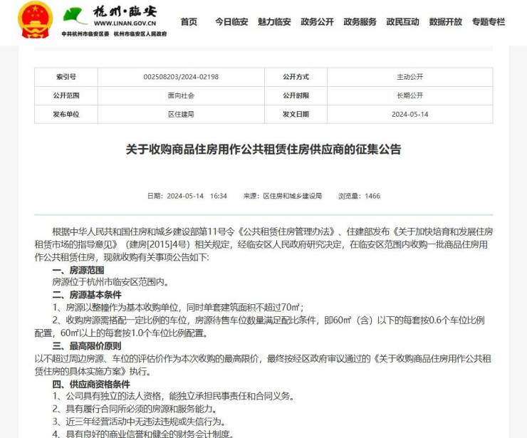 5月14日,杭州市临安区住房和城乡建设局的一则征集公告透露了即将在区内收购一批商品住房用作公共租赁住房的消息。