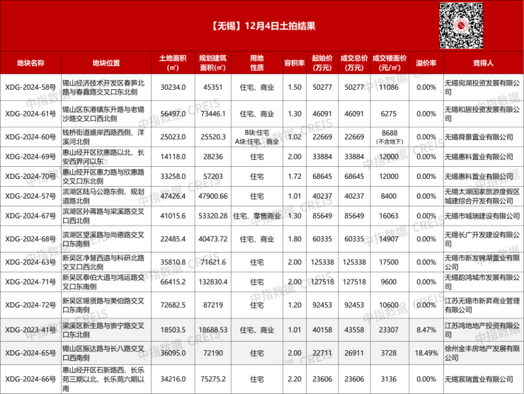 12月4日,江苏省无锡市成交14宗涉宅地块,其中2宗地块溢价成交,12宗地块底价成交,总成交额84.72亿元。