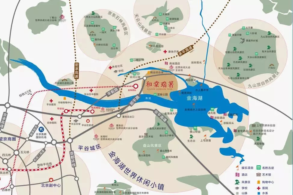 15万方商业综合体、3.7万方会展中心、22处山水资源、高端休闲娱乐场所环伺周边,“双高速、双轨道” (京平高速、承平高速、地铁22号线、S3支线)立体交通纵横交错,从现在到未来,全面满足业主在不同人生阶段的生活所需。