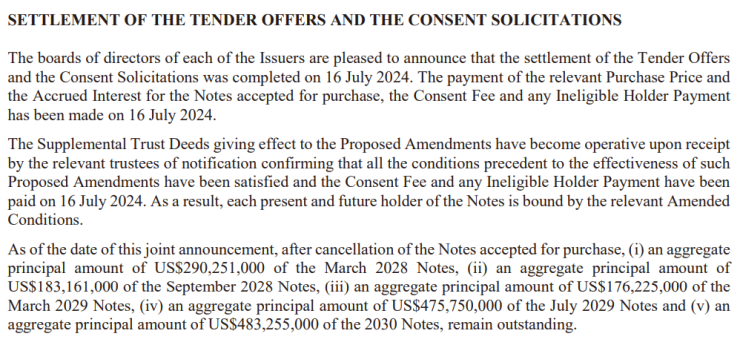 截至7月16日,在注销被接受购买的票据后,5只美元票据未偿还本金额约16.08亿美元。其中,2028年3月票据的未偿还本金额为2.90亿美元,2028年9月票据的未偿还本金额为1.83亿美元,2029年3月票据的未偿还本金额为1.76亿美元,2029年7月票据的未偿还本金额为4.76亿美元,2030年票据的未偿还本金额为4.83亿美元。