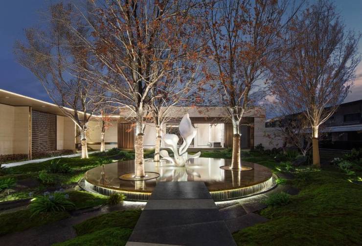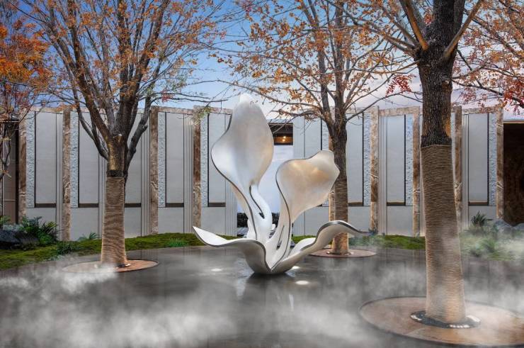 跨越大半个地球运抵的巴西彩虹印象奢石水盘在雾森氤氲中若隐若现,白蜡神木的枝叶在晨昏鎏光中镀金,「兰心隐萃」雕塑——以凤凰羽翼为灵感卷曲出玉兰花瓣,每一片都是经过匠人以打磨艺术品般的匠心和技艺反复雕琢,毫厘不差的校准,才能如此栩栩如生的呈现。