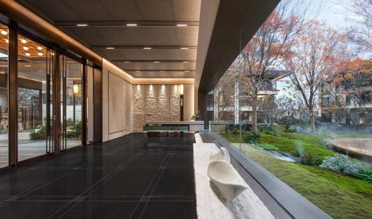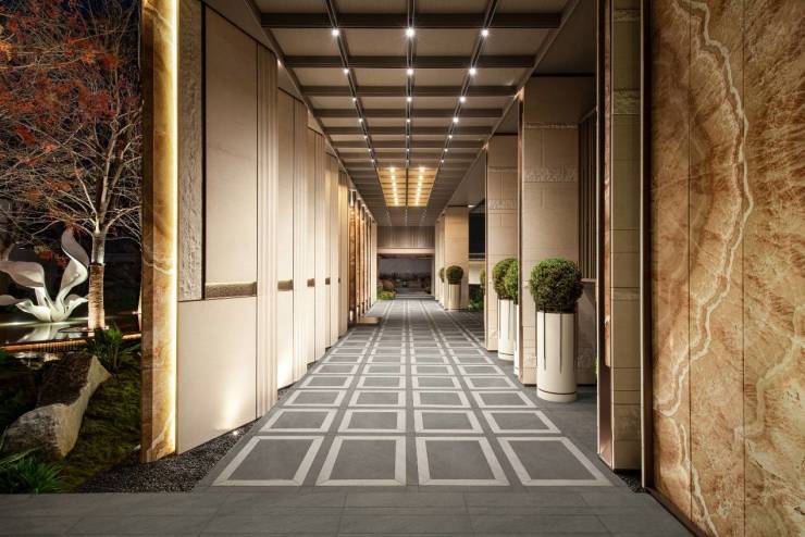 行至星级酒店式大堂,设计师以京都安缦“借景”手法,通过高约6米、宽约20米的通透玻璃全景舱,将水、庭、树、石等框景成画,在20盏水晶灯的璀璨辉映下,归家者穿行其间,宛如漫步“光影回廊”——每一步都暗合“奢隐雅意、水聚财源”的东方哲思。
