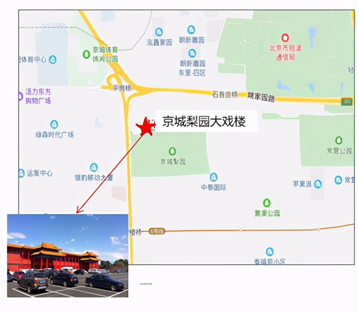从姚家园路向东行驶穿过平房桥桥下右转沿平房路向南行驶约1.1公里即到。导航直接搜索“京城梨园大戏楼”即可。