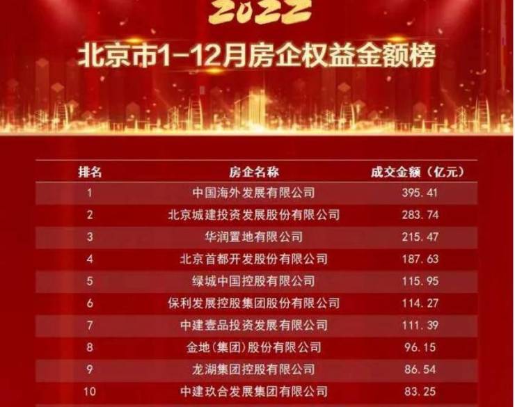 不过,在此背景下,北京仍不乏“红盘”搅动局部“火热”行情,尤其是高端住宅一枝独秀,将北京房价微幅拉升。据克而瑞北京统计,2022年,北京诞生3个百亿楼盘,为北京城建天坛府、学府壹号院、中建壹品·学府公馆,它们的单价均超过8万元/平方米;从房企销售额来看,中海是唯一权益销售额突破300亿元的房企,而以合作开发见长的北京首开则蝉联全口径销售榜首位。