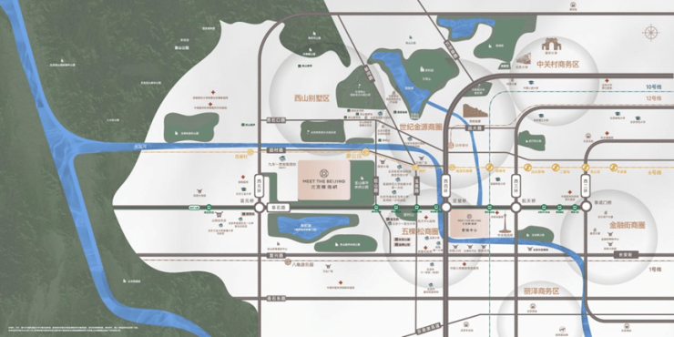 北京隅·海岄位于海淀西四环宝山板块,距离地铁6号线廖公庄站约600米。更值得关注的是,项目西北侧规划有九年一贯制学校,这对注重教育的海淀家庭来说极具吸引力。生态层面,项目南侧紧邻城市绿地,三面被超规划绿地环抱。社区内部“两轴九章五艺”立体园林与外部自然资源呼应,真正实现了“出则繁华,入则宁静”。