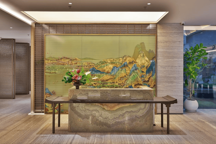 为了让建筑与香山气韵相融,研发团队耗时十月复刻汝瓷 "雨过天青云破处" 的釉色,将仿汝窑工艺应用于建筑立面,指尖划过陶板,能触到 "似玉非玉而胜玉" 的温润;为了实现空间的浑然一体,双国企匠人用反复校准,让建筑线脚、景观铺装、室内地砖的拼接达到“三缝合一”的工艺背后,亦是对仅供品质的偏执;更遑论园林的迭代:以《园冶六观》为指导,以《千里江山图》与《溪山行旅图》为蓝本,精筑 "两轴五园十六景" 让山园呼应的庭院泛起宋画般的朦胧;围绕三棵百年古树打造下沉观景游廊,夏夜坐听蝉鸣与流水和鸣,让自然的诗意更添层次。