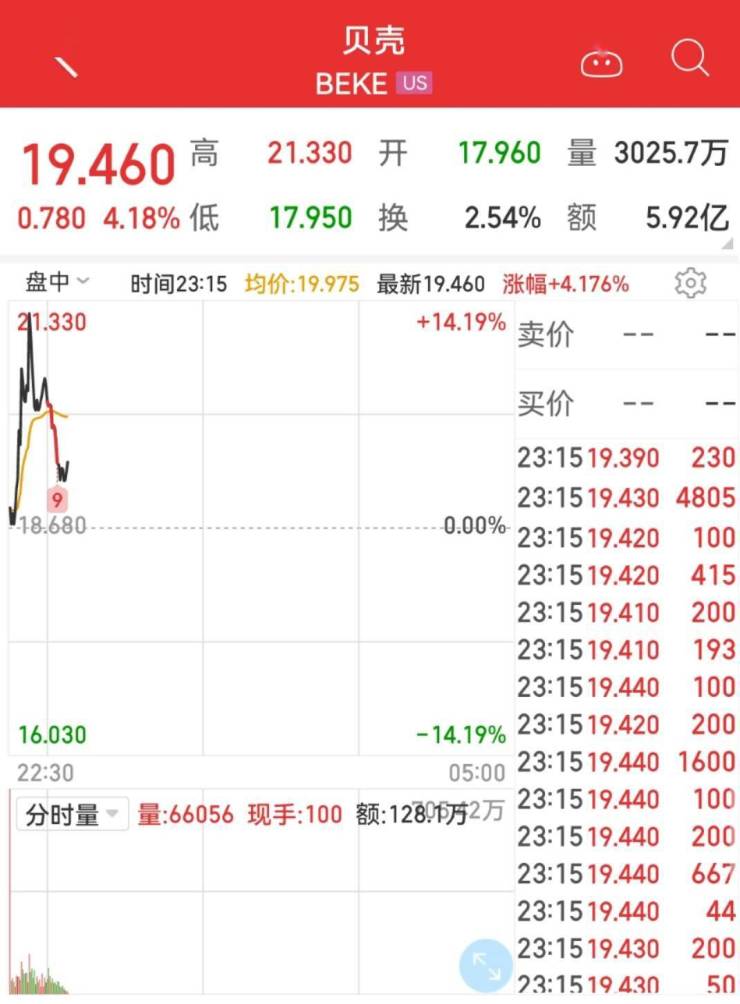 红星资本局注意到,截至发稿,贝壳的股价约为19.46美元/股,涨4.18%。