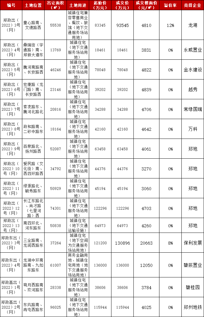 6月22日,河南省郑州市2022年首批集中供地正式开拍,本次共出让土地15宗,最终2宗溢价成交,13宗底价成交,共收金106.74亿元,总出让面积663259平方米。