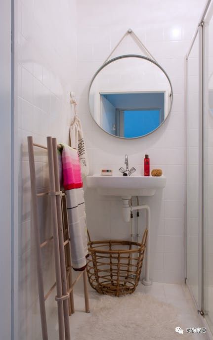 ▲全白色的浴室中添加一些天然材料和鲜艳的颜色,舒适又时髦。