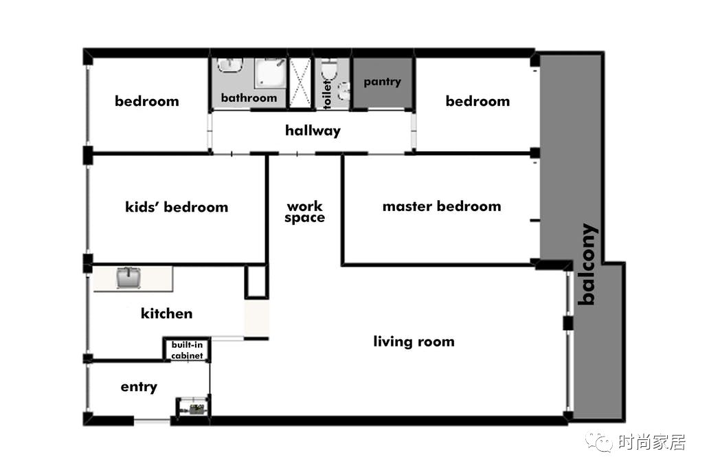 ▲户型图特地放在这里,是因为女主人工作室的位置比较特殊:设置在客厅与卧室间的走道上,看平面图,才能清楚明白这个布局。