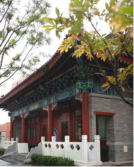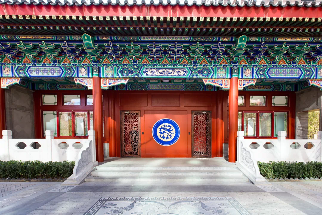 南大门即一道门是整个园区宅门,以厚重石材打造,寓意厚德载物。从一道门入内就是入园庭院。庭院南低北高,入园后逐级而上进入园区,取意步步高升。二道王府大门,作为老北京四合院宅门中的“顶配”,彰显厚重威仪的贵族风范。同时,二道门以府门与垂花门融合,以大宅标配的垂花门彰显大宅格调。如此打造的宅门,成本远高于普通宅门。三开间的殿式门,屋脊上的吻兽,即老北京常说的“五脊六兽”。双金龙宋锦,枋心,金线大点金,旋子彩画,府门又兼影壁,门正中绘有五蝠,与恭王府同样,取意五福盈门。