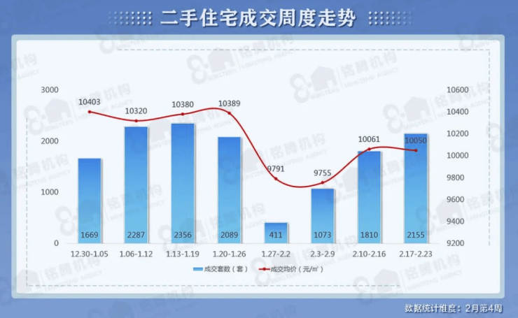 铭腾机构数据也显示,上周重庆中心城区二手房住宅共成交2155套,环比上涨19%,成交价格10050元/平方米,成交套数连续三周上涨。