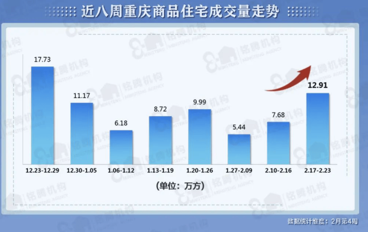 2月以来,重庆楼市热度有所上升。铭腾机构数据显示,上周重庆中心城区商品住宅成交量达到12.91万平方米,环比上涨68%,合计1247套,成交量连续两周上涨。上周重庆新房成交面积,也是近7周来新高。