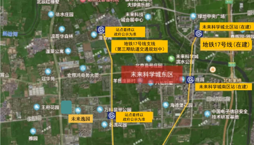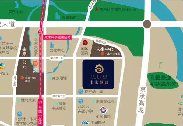 位置上看,未来慧园项目位于未来科学城一期南区门户位置,距地铁17号线未来科学城南区站约500米。东邻京承高速,西邻在建的商务商业配套项目,南邻未来金茂府项目,北邻未来中心项目。