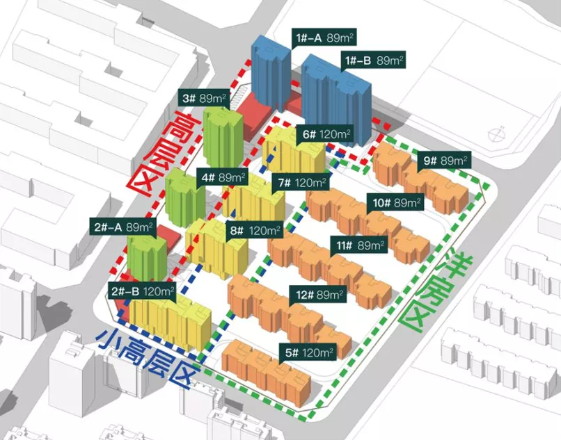 整个地块涵盖居住、公共服务配套两种业态,其中住宅楼16栋、1084套房源,90平方米两居832套,120平方米三居252套,均为一梯两户、南北通透设计,并做到动静分区、干湿分离;1栋公共服务设施配套楼,面积约3373平方米。