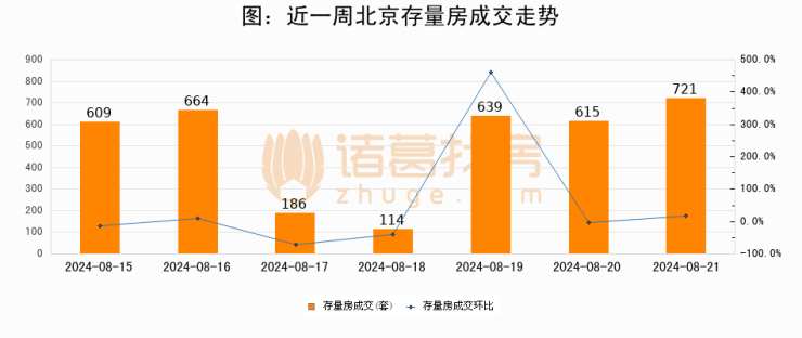 从存量房来看,2024年08月21日北京存量房单日成交721套,比昨日增加106套,环比上涨17.2%。从近一周存量房成交来看,北京存量房日均成交套数为506套,08月21日单日成交721套,高于近一周平均水平42.5%。