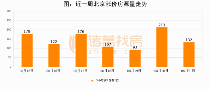 根据诸葛找房数据显示,北京24小时涨价房源量为132套,较08月20日减少81套,环比下降38%。与此同时,涨价房源占比小幅回落,对于购房者来说是一个入市窗口期,购房者可抓住时机入市。