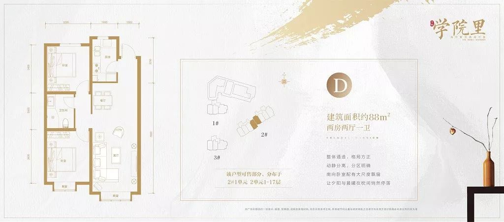 88㎡两居 方正通透,位于2#楼1单元、2单元1-17层,共34套。总价约为751万。