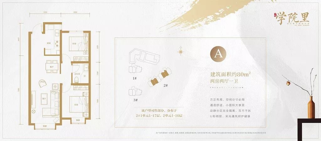 80㎡两居 项目较小户型,位于2#楼,可售部分为1单元1-17层、2单元1-10层,共27套,总价约为683万。