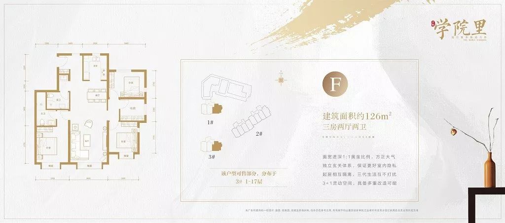 126㎡三居两卫 项目较优户型,方正通透,位于1、3#楼东边户,可售部分为3#楼,共17套。总价预计为1076万。