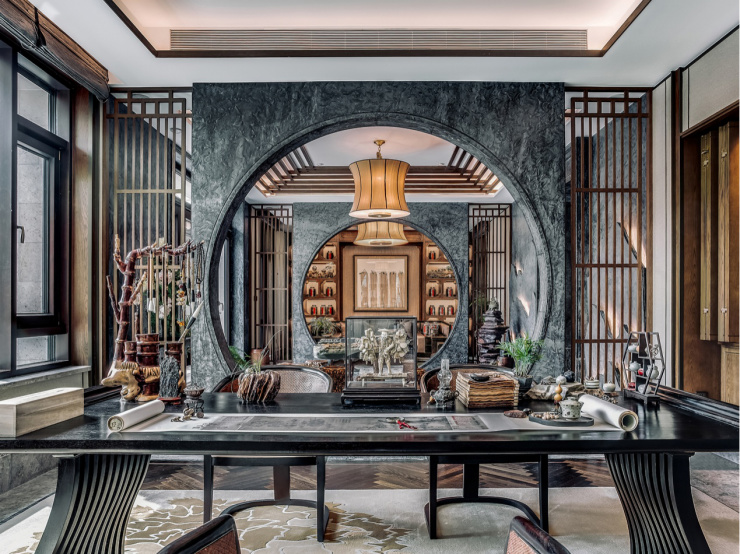 整座室内空间布局以宋代美学格调作为细绢画布衬底,把宋词中缠绵婉转的描写转化为具象的空间情境,营造出一种新中式风格的优质表现。同时,在细节处加入现代新巧的元素搭配,使得空间在古典韵味上焕发出崭新的时代精神,再现宋朝士大夫阶层生活趣味的“西园雅集”之疆域。