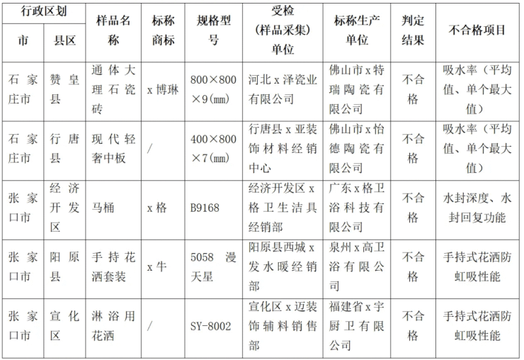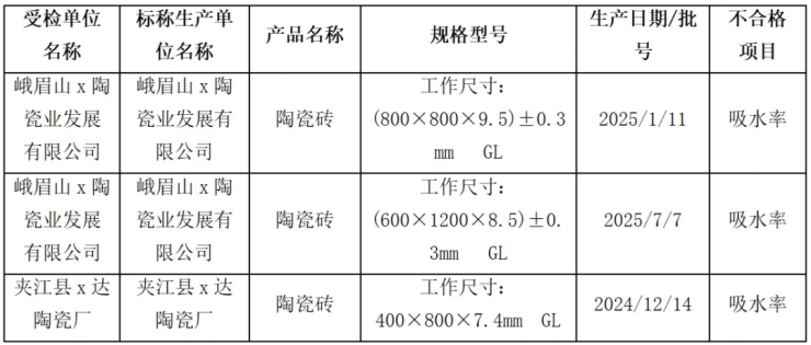 近期,广东省云浮市市场监督管理局、河北省市场监督管理局、四川省市场监管局分别公布了2025年工业产品质量市级监督抽查结果,其中多批陶瓷砖、卫生洁具被检出不合格。