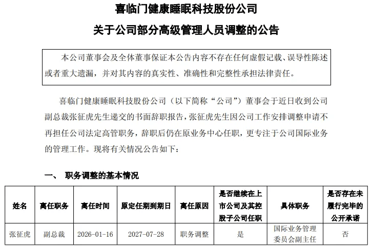 2026年1月16日,喜临门健康睡眠科技股份公司发布高管调整公告,宣布公司副总裁张征虎因职务调整离任,其原定任期至2027年7月28日。