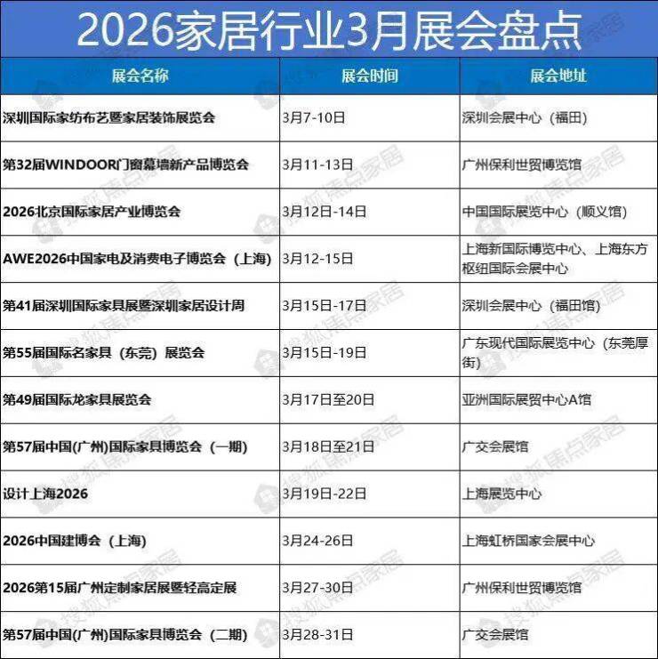 三月春风起,家居行业忙。作为全年行业趋势的“风向标”和商贸对接的“主战场”,2026年3月家居展会矩阵全面铺开,从设计创新到全链协同,从定制升级到消费赋能,各类展会精准覆盖不同赛道需求。2026年3月,12大家居展会即将举办,搜狐焦点家居提前盘点梳理,为您解读展会亮点。