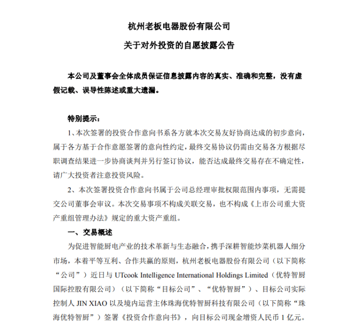 老板电器1月12日晚间发布公告称,为促进智能厨电产业的技术革新与生态融合,携手深耕智能炒菜机器人细分市场,公司近日与优特智厨国际控股有限公司(以下简称“目标公司”、“优特智厨”)、目标公司实际控制人 JIN XIAO 以及境内运营主体珠海优特智厨科技有限公司(以下简称“珠海优特智厨”)签署《投资合作意向书》。根据协议,老板电器将以现金增资1亿元的方式入股优特智厨。