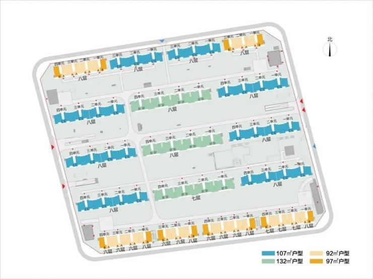 小区规模共计5排楼17栋978户,本次开盘南边3排楼,共计10栋578套房,开盘户型92/97三居室202套,107三面宽三居室224套,132眼镜户型四居室112套,75两居室顶层退台户型32套,96三居室顶层退台户型8套房。