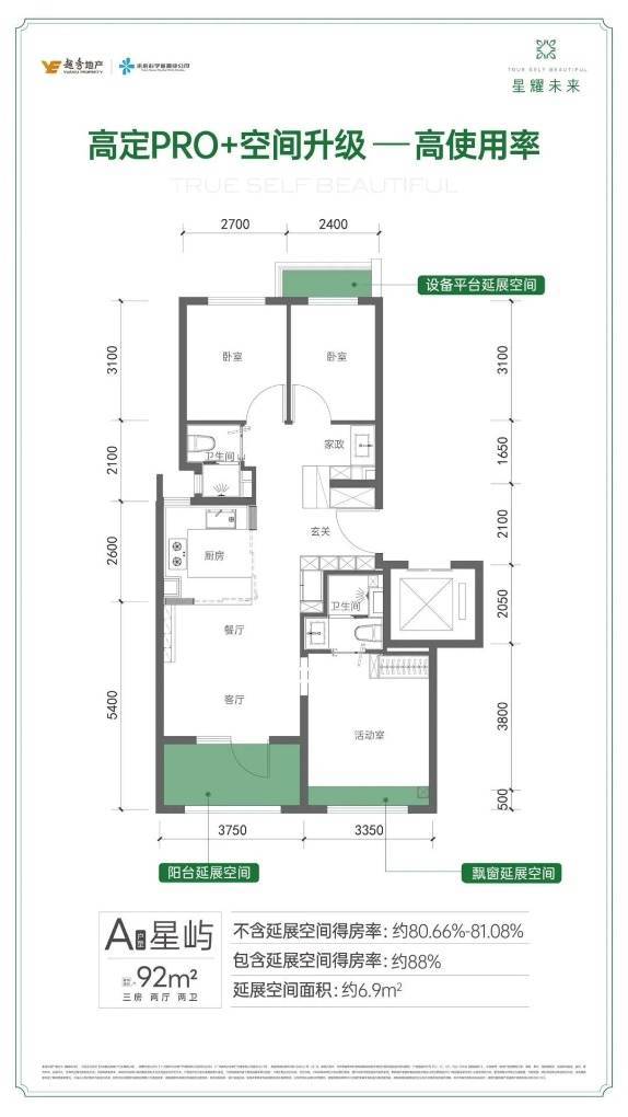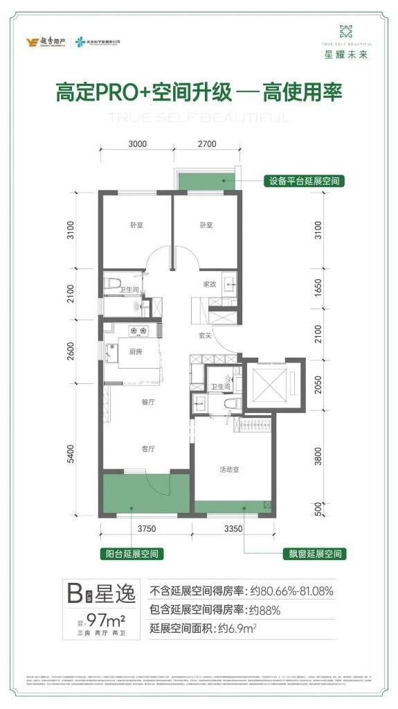 92/97㎡的两面宽三居,包含延展空间,得房率达到88%;
