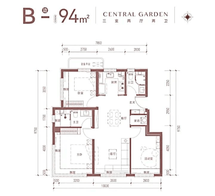 98平三室两厅两卫,标准的四叶草户型,带一家政间。